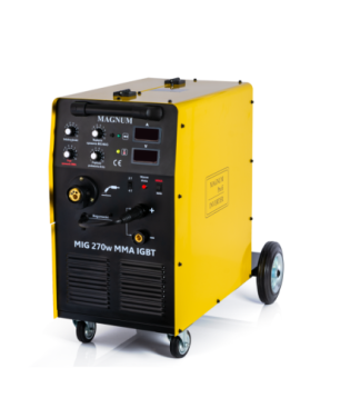 Urządzenie MAGNUM MIG 270w MMA IGBT to profesjonalny półautomat spawalniczy zasilany z sieci trójfazowej 400 V o maksymalnym prądzie spawania 280 A. Urządzenie umożliwia spawanie łukowe topliwym drutem elektrodowym MIG/MAG, drutem samoosłonowym FCAW (należy zmienić biegunowość w spawarce: minus (-) na uchwycie spawalniczym, plus (+) na masie), oraz metodą MMA z wykorzystaniem elektrod otulonych (rutylowych, zasadowych, kwaśnych).